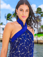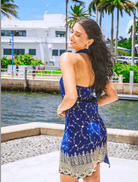 This chic navy dress features a halter neckline and intricate gold embroidery along the hem, blending elegance with a bohemian flair. It's short, with a 3 inch slit in the back. Its lightweight design is perfect for warm weather, making it ideal for a stylish day out by the marina or a casual seaside event. Pairs beautifully with heels.