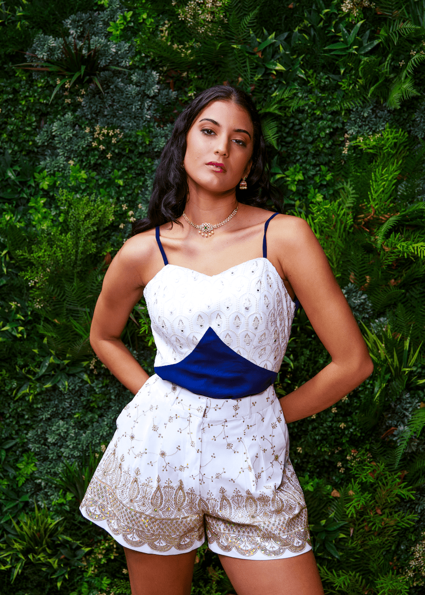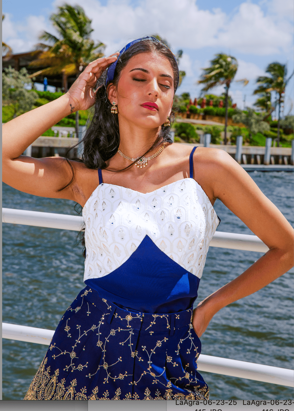 This striking top features a chic two-tone design with a white front adorned with intricate mirror work embroidery and a bottom a bold navy. This unique cut makes it perfect for warm weather or a stylish outdoor event. Ideal for pairing with matching prism shorts or jeans.