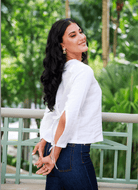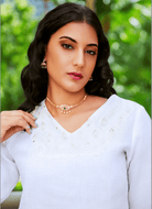 This chic white linen top boasts a lightweight, breathable fabric with a delicate texture, ideal for a casual yet refined style. The long sleeves and V-neck design lend a sophisticated flair, while intricate mirror work along the collar and a slit from wrist to elbow with ties on the sleeves add unique elegance. Perfect for warm weather or a fashionable outdoor occasion.